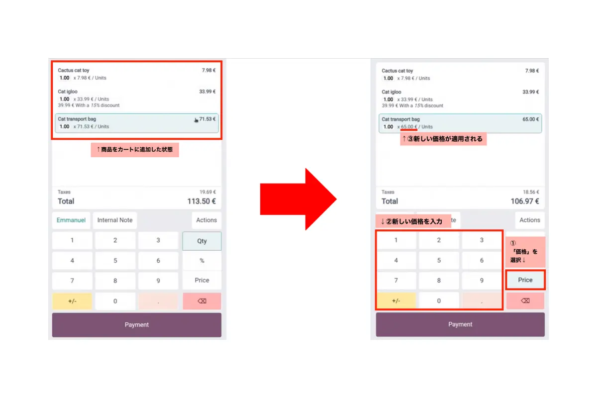 続いて、電卓ボードを使って適用したい新しい価格を入力します。すると、カートに追加された商品に新しい価格が適用されます。(例:「Cat transportation bag」の価格を65ユーロに変更)
